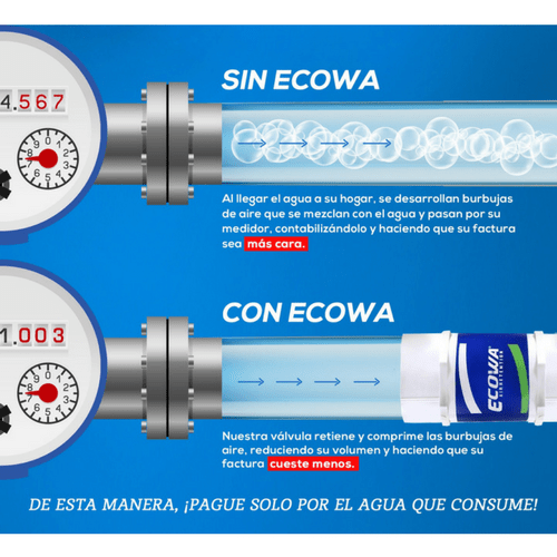La válvula ECOWA Air Retention® retiene el flujo de agua para crear una contrapresión hacia atrás, la cual comprime el aire contenido en las tuberías municipales para reducir su volumen y así, el medidor de flujo volumétrico (mejor conocido como medidor de agua), contabilice menos volumen de aire, generando un ahorro en la facturación de agua.